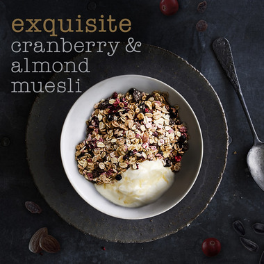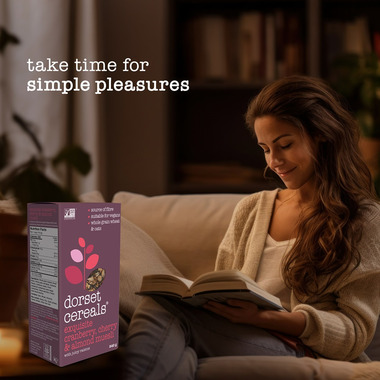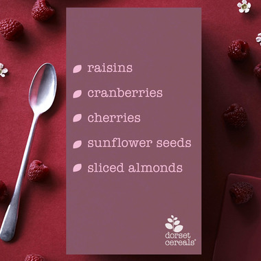 Treat yourself to something exquisite. Dorset Cereals Exquisite Cranberry, Cherry & Almond Muesli bursts with berry and nut flavours you’ll love. Packed with cranberries, cherries, raisins, sunflower seeds and sliced almonds, our premium muesli is made to savour. Enjoy a bowl with your favourite milk for a hearty breakfast that will fuel your day.