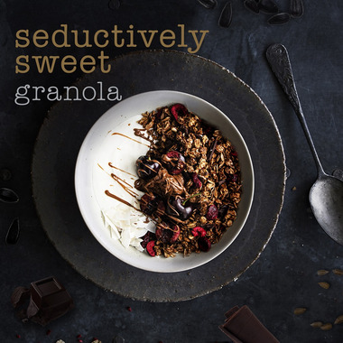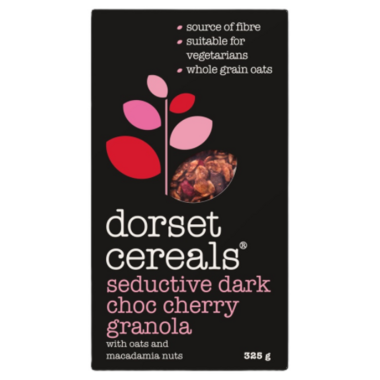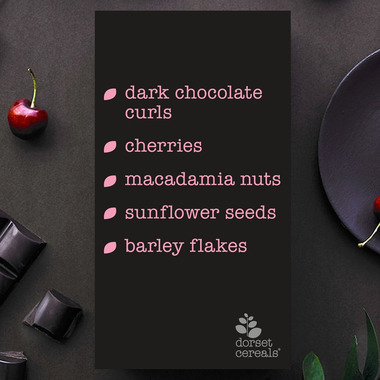 Whole grain oat flakes, Sugar (golden syrup], Barley flakes, Vegetable oil, Dark chocolate curls (cocoa solids: 70% minimum (cocoa mass, beet sugar, cocoa butter, emulsifier (soy lecithin), flavour)), Freeze dried sliced cherries, Macadamia nuts, Cocoa powder, Sunflower seeds.