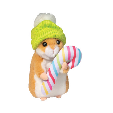 The holidays are full of sweet things, one of which being this plush Hamster with his rainbow striped candy cane! Dressed in a lime green hat embellished with a fluffy, white pompom, this adorable winter friend has come to share the good tidings of the season with you! With his large, dark eyes and engaging upright pose it's hard to ignore the appealing looks of this festive pocket pet. Will you find a place for him amidst your seasonal decor or enlist him to serve as a unique stocking stuffer? No matter what job you find for him, this colorful little Hamster stuffed animal is sure to elicit smiles!