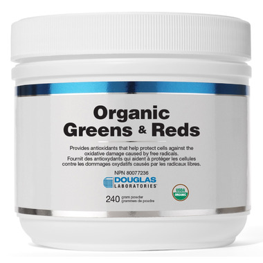 Organic Greens & Reds Powder, provided by Douglas Laboratories®, is a concentrated, all-natural blend of organic grasses, fruits and vegetable powders that can mix in water or other liquids to make a delicious, healthful drink.  This product is sugar free, gluten free and is suitable for vegetarians.