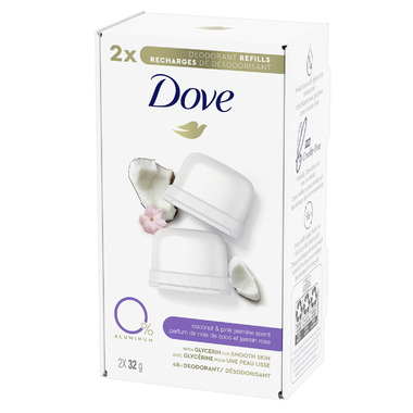 Are you ready to make sustainable changes to your skin care routine? Join the refillable revolution with Dove Deodorant Stick Refills, helping you on your journey to caring for the planet, one refill at a time. Each refill kit comes with two refills in 98% recycled plastic to keep them fresh until you're ready to slot them into your reusable deodorant container. It's a little change, but feels so good. Plus, Dove's 0% aluminum deodorant formula is designed to give you the Dove care you know and love. The beautifully clean scent that balances, creamy coconut with the delicate fragrance of pink jasmine petals, will give you a little moment of joy every time you use it. With moisturizers enriched with glycerin for skin nourishment, skin care is the priority with this refillable women's deodorant.
