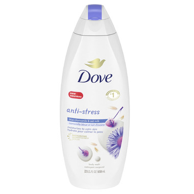 - Dove Anti-Stress body wash with Microbiome Nutrient Serum, blue chamomile and oat milk scent moisturizes to calm skin in just one shower