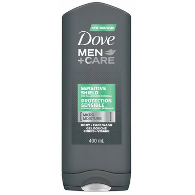 Dove Men + Care Sensitive Shield Face and Body Wash has a hypoallergenic formula with light fragrance and is clinically proven to fight skin dryness and rinse clean.