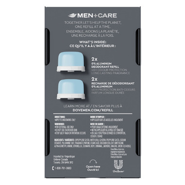 Ready to switch to refillable deodorant? Try Dove Men+Care Ultimate Clean Touch 0% Aluminum Deodorant Refill. You can use Dove's refills with their stainless steel, refillable deodorant kit to help reduce the amount of plastic waste you throw away. Buy the kit once, refill it for life. Dove lifetime guarantee means you are covered, no matter what. This powerful aluminum-free deodorant for men offers up to 48-hour protection against odour, so you can enjoy a fresh, long-lasting fragrance all day. The non-irritant formula contains glycerin and Dove's Triple Action Moisturizer technology. The result? Fresh, cared-for underarms. Join us on our journey to help reduce plastic waste.