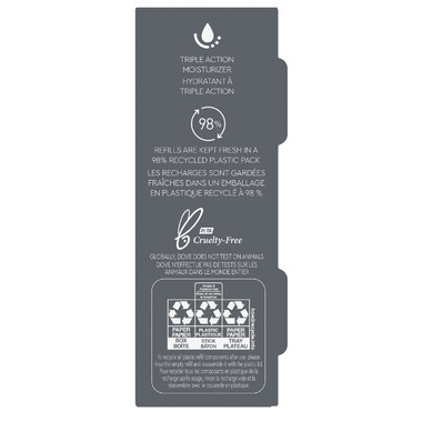 - The refill packs of the Dove Men+Care men's deodorant are made with 98% recycled plastic and are recyclable