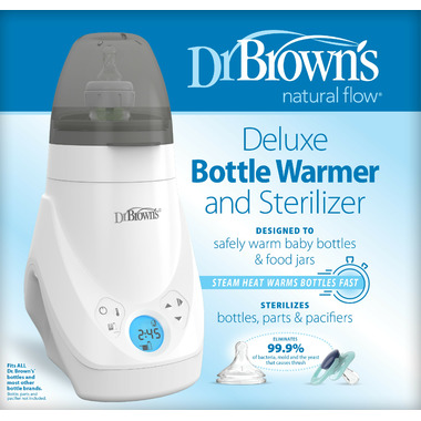 The bestselling Dr. Browns Deluxe Bottle Warmer is now pulling double duty! Quickly and safely warm bottles and food jars and sanitize using steam heat with the Dr. Brown's Deluxe Bottle Warmer & Sterilizer. Fast warming is at your fingertips! With the press of a few buttons, you can easily find preprogrammed warming settings for many combinations of baby bottle type, size, and temperature from warming breast milk to heating up baby formula. An audible alarm with auto shut-off tells you when it֒s done, so there's no risk for overheating.