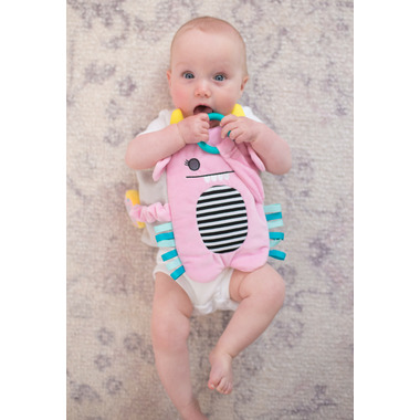 - Crinkly ears, accordion arms and color tags engage baby in sensory play