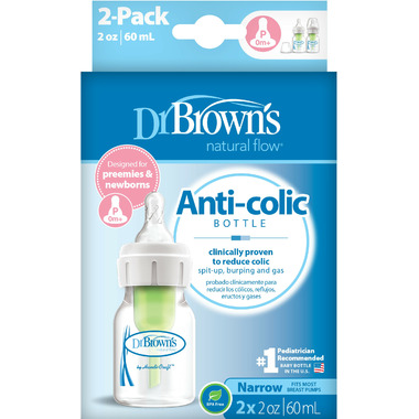 The best baby bottles are also the perfect baby bottles for preemies! Dr. Brown's Natural Flow Options+ Narrow Preemie Baby Bottles are sized just right for premature babies. Dr. Brown's Preemie Baby Bottles feature our slowest-flow nipple, the Dr. Brown's Preemie Nipple that offers a very slow flow for babies who are premature or with feeding difficulties. The small, 2 oz/60 ml Options+ bottles are sized just right for small tummies. An enhanced, anti-colic internal vent system features innovative feeding experience that's clinically proven to reduce colic, decreases spit-up, burping and gas, better preserves nutrients in breast milk and formula, and aids in digestion for a good night's sleep. Together with the Preemie Flow Nipples, the Options+ Narrow Preemie Bottle offers a flow rate that supports breastfeeding.