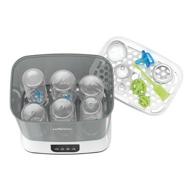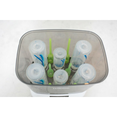 Steam sterilize and dry up to six baby bottles at once, or breast pump parts, pacifiers and teethers with Dr. Brown's Bottle Sterilizer and Dryer. The bottle sterilizer eliminates 99.9% of bacteria, mold and the yeast that causes thrush. If the lid is unopened, contents stay sterilized for up to 24 hours after the completion of your cycle meaning you can keep your bottles and parts stored inside with no contamination. The two included HEPA Type filters capture up to 95% of airborne particles, ensuring purified air for bottle drying. Each filter lasts for up to 6 months for a full year of filtration. Easy-use operation lets you sterilize only, dry only, or combo sterilize and dry. Adding new water is easy with the included measuring cup, along with the accessory tray that helps you keep everything organized when loading. The removable basket is designed to fit all Dr. Brown's bottles perfectly.