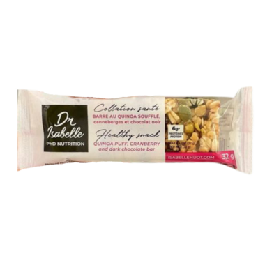 Dr. Isabelle PhD Nutrition Quinoa Puff, Cranberry and Dark Chocolate bar has 6g of protein.