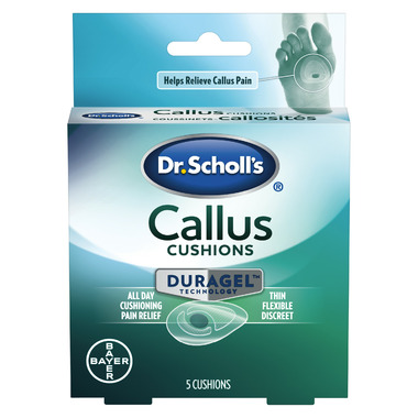 Dr. Scholl's® Callus Cushions with advanced DURAGEL™ Technology surround calluses and hard skin with a soft comfortable gel to provide immediate relief in a cushion so thin, it fits easily in any shoe.