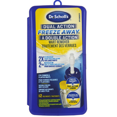 Dr. Scholl's Dual Action Freeze Away Wart Remover has freeze therapy plus fast acting liquid. It is Dr.School's strongest wart remover without a prescription and starts working instantly in as few as 1 treatment cycle. It is doctor recommended for common & plantar warts.