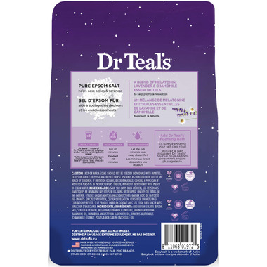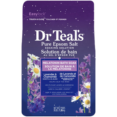 Dr Teal's Pure Epsom Salt Soaking Solution Melatonin Bath Soak. Lavender and Chamomile Essential Oil Blend helps calm the mind and helps ease aches and soreness.