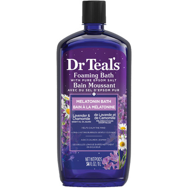 Dr Teal's Foaming Bath with Pure Epsom Salt. Melatonin Bath Lavender and Chamomile Essential Oil Blend. Helps calm the mind. Long-lasting bubbles gently cleanse.