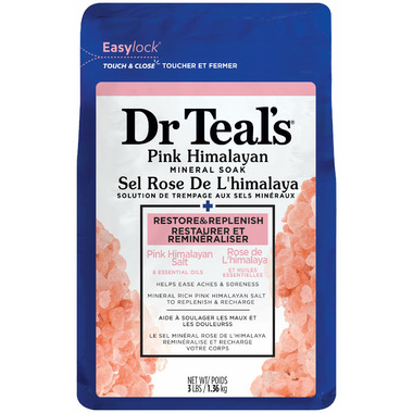 Dr Teal's Pink Himalayan Mineral Soak. Restore and Replenish. Pink Himalayan Salt and Essential Oils helps ease aches and soreness. Mineral rich pink himalayan salt to replenish and recharge.