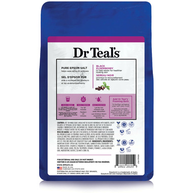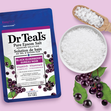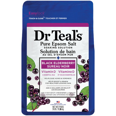 Dr Teal's Pure Epsom Salt Soaking Solution Black Elderberry with Vitamin D and Essential Oils. Pure Epsom Salt helps ease aches and soreness. Helps boost and renew the body and essential oils uplift mood.