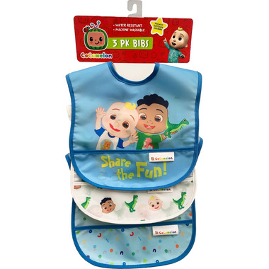 Hang with JJ and friends during meantime. Made from lightweight, easy wipe, machine washable waterproof fabric, these bibs will get your child through the messiest of meals. Cocomelon Wipe Clean Bibs feature a hook and loop closure for a quick, adjustable and tug-proof fit. With a handy catch-all pocket for containing spills, this bib is a great addition to any mealtime.