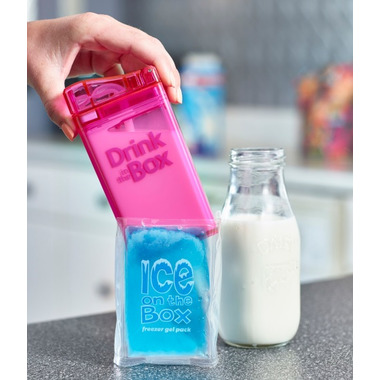 Get Drink in the Box freezer gel pack to keep drinks cold. Made of a safe, soft, hand washable polyethylene exterior, with freezer gel interior. The bottom stirrup holds it in place so it won't slip off. Just keep Ice on the Box in the freezer then slip on your Drink in the Box so drinks will stay cold until lunch time!