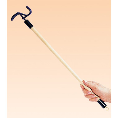 Drive Medical Dressing Stick with Padded Handle has a plastic coated "S" hook at one end and shoe horn on opposite side.