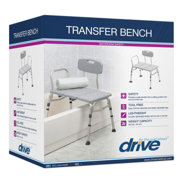 Getting into and out of the tub can be quite a challenge if you suffer from poor balance, arthritis, limited mobility, or injury issues. If you're finding that simply taking a shower has become a concern, you might find that a transfer bench from Drive Medical is the solution you've been looking for. The transfer bench allows you to sit down outside of the tub and then maneuver yourself into the tub where you can remain seated throughout the shower. You'll find the experience more comfortable and safer than before with a stable plcae to sit in the tub. Plus, you'll eliminate the need for assistance, increasing your independence. The Three Piece Transfer Bench is lightweight, assembled without tools, and has height adjustable legs with non-slip feet making it a simple, easily portable and safe bathing solution. It also includes a removeable backrest and armrests to make the experience of sitting in the shower even more pleasant.
