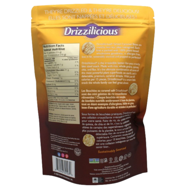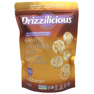 Drizzilicious Salted Caramel Bites are crunchy mini rice cakes re-imagined! Each bite is packed with 100% plant-based wholesome goodness, is allergen free, low in fat, sustainably sourced, and popped to perfection!