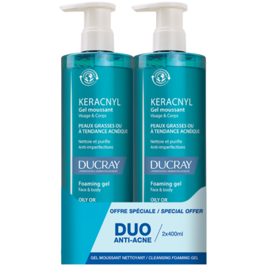 DUO offer of Keracnyl Foaming gel, a daily face and body cleanser suitable for oily and/or acne-prone skin on teenagers and adults alike.