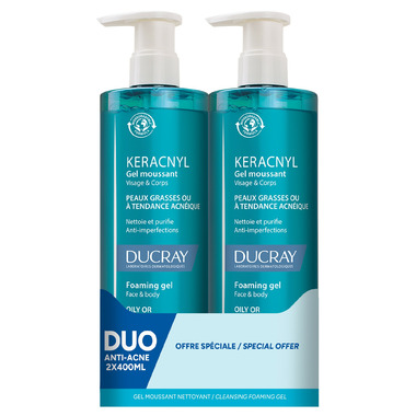 DUO offer of Keracnyl Foaming gel, a daily face and body cleanser suitable for oily and/or acne-prone skin on teenagers and adults alike.
