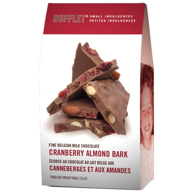 A Dufflet classic, all dressed up in distinctive holiday flavours—crunchy almonds and dried cranberries covered with all-natural, fine Belgian milk chocolate. This bark is creamy, crunchy and sweet.