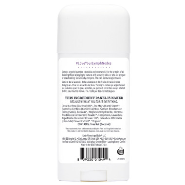 Ingredients: Cocos Nucifera (Coconut) Oil*, Zea Mays (Corn) Starch*, Euphorbia Cerifera (Candelilla) Wax, Sodium Bicarbonate (Baking Soda), Beeswax*, Magnesium Hydroxide, Maranta Arundinacea (Arrowroot) Powder*, Tocopherol, Lavandula Angustifolia (Lavender) Flower Oil*, Calendula Officinalis (Calendula) Flower Extract*  *Organic