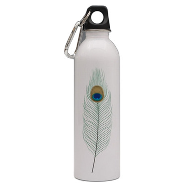 The iridescent blue-green coloured peacock feather on this water bottle is an ancient symbol of compassionate watchfulness, good-will, nurturing, kind-heartedness, and even eternal life!