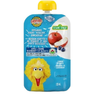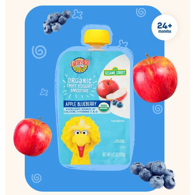 Earth’s Best Organic Sesame Street Smoothies are an excellent source of calcium and vitamins C and D for growing toddlers. Their smoothies are made with real yogurt and fruit puree for a snack that’s just as wholesome as it is yummy, made extra fun with our friends from Sesame Street. Earth’s Best Organic Apple Blueberry Smoothie is made with real organic apples, blueberries + yogurt. For little ones 2+ years. Excellent source of Vitamins C&D, Excellent source of Calcium, No artificial flavors or colors, USDA Certified Organic, Made with non-GMO ingredients, For toddlers 2 years and older.