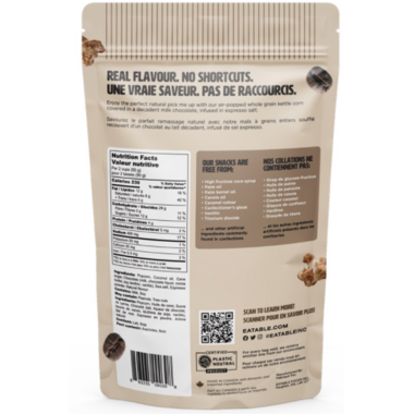 Popcorn, Coconut oil, Cane sugar, Chocolate (milk, chocolate liquor, cocoa butter, soy lecithin, vanilla), Sea salt, Espresso powder, Natural flavour Contains: Milk, soy Made in Canada with locally-sourced and imported ingredients.