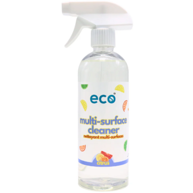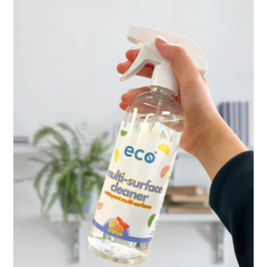 Eco Company's multi-purpose surface cleaner is citrus-scented. This cleaner is tough on grease and leaves no residue. For use on hard, non-porous surfaces. For heavily soiled surfaces, spray onto the surface and let stand for a few minutes. Clean and wipe with a clean, damp cloth. For cleaning floors and walls, dilute 1/2 cup in 4L of hot water. No rinsing or wiping dry required. Precaution: Avoid contact with eyes and skin. Keep out of reach of children. Keep from freezing. First Aid: If in eyes, rinse with water for several minutes. If swallowed, drink a lot of water. Do not induce vomiting. Seek medical attention, if needed. Keep out of reach of children.