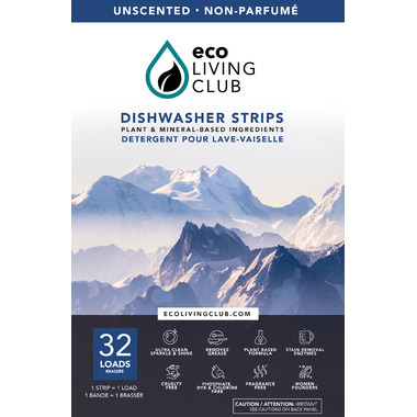 Eco Living Club's Dishwasher Detergent Strips - 32 Loads. Ultra clean sparkle & shine. Removes grease and baked on foods and a plant-based formula. Contains stain removing enzymes. Cruelty-free, phosphate, dye and Chlorine Free, Fragrance Free, Any dishwasher/hard or soft water, perfectly portioned, lightweight and takes very little space.