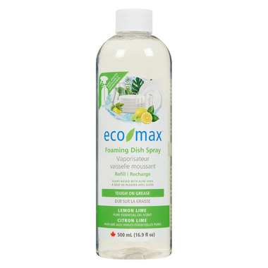 Eco-Max Foaming Dish Spray Refill saves you money and uses less plastic. Reuse your foaming trigger sprayer from our non-refill product. Foaming Dish Spray is the quickest way to hand-wash dishes, cutlery, glasses, pots and pans. Just spray, wipe, and rinse. This convenient, plant-based foam dish detergent saves time and water. Its perfect for cleaning while you cook and for households that typically hand-wash fewer dishes at a time. With its readily biodegradable formula, it's also a great companion on picnics, camping and other outdoors trips. With a fresh lemon lime essential oil scent.