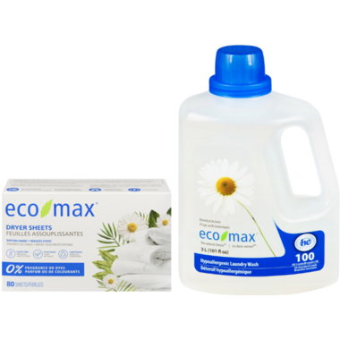 An all-natural, plant-based laundry wash in a hypoallergenic formula for sensitive individuals and those who simply love scent-free. Its low-foam, no residue formula is safe for washing infant clothing and can be used in high efficiency or standard washing machines. One jug will wash 100 HE loads. Eco-Max Dryer Sheets reduce static and soften your fabrics in a gentle way. Utilizing plant based ingredients, these sheets are compostable, unscented, and biodegradable, and are made from plant cellulose with no plastic. Use one sheet per load by placing it in dryer on top of wet clothes. After use, dispose sheet into garbage receptacle.