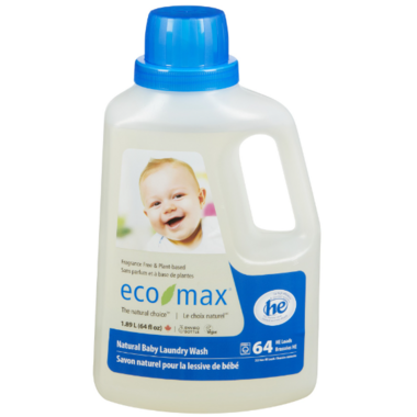 Eco-Max Natural Baby Laundry Wash effectively cleans fabrics without common allergens or hazardous chemicals for a gentle clean that's safer for sensitive skin. This readily biodegradable formula is safer for baby clothes, cloth diapers, septic tanks and aquatic species.