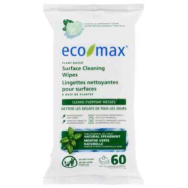 Eco-Max Surface Cleansing Wipes gives you quick and convenient solution to cleaning your hard surfaces. No need to find the spray bottle and something to wipe with. Scented with pure spearmint essential oil. The wipes are compostable and biodegradable, with no plastic. Reduce plastic and wasted paper towels with these surface cleansing wipes.