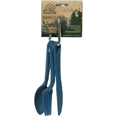 This EcoSouLife Biodegradable Cutlery Set is made from bamboo. A sustainable everyday product, the plate will naturally biodegrade once buried the ground. The complete set contains a fork, spoon, and knife, as well as a carabineer to keep them all together.