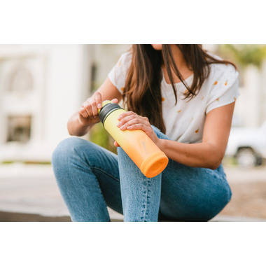 This dual opening lid is easy to grip, has a wide mouth for easy filling, and a soft silicone spout for a comfortable drinking experience. The lid is securely attached to a sturdy carrying strap, so you always know where it is, and the leakproof seal keeps your drinks in the bottle - where they belong. The BOULDER stainless steel water bottle also includes a removable strainer for tea, fruit, and ice cubes. The fitted silicone bumper adds protection against everyday drops. Keep the BOULDER in your car cup holder or toss it into a tote and bring it to the gym, on the trails, or to work to stay healthily hydrated through the day.