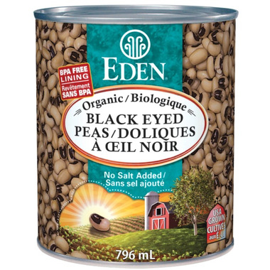 Organically grown Black Eyed Peas, soaked overnight and expertly cooked at Eden's certified organic. A Southern favorite and the centerpiece of the classic dish Hoppin' John, folklore has it they bring good luck. No salt added, packed in bisphenol-A free cans.
