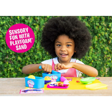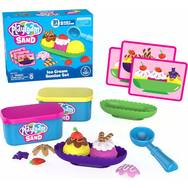 Includes: 2 colors of Playfoam Sand, two sundae boats, ice cream scooper, 20 play toppings, and 10 order cards.