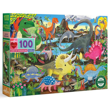 eeBoo Land of Dinosaurs 100-piece jigsaw puzzle is the perfect puzzle for young paleontology enthusiasts! This giant, floor-sized puzzle features triceratops, stegosaurus, brontosaurus, and other dinosaurs living in perfect harmony! Colorfully illustrated by Linda Bleck.