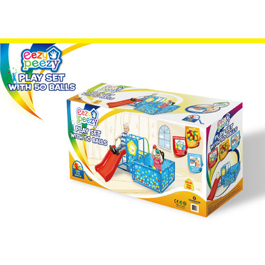 - Includes 50 balls, slide, target, ball storage, toss target.