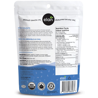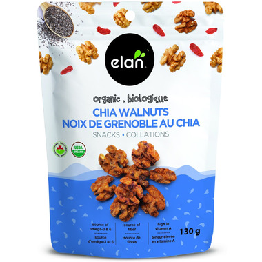 Elan’s organic chia walnuts are sourced form the best growers before being prepared with tangy goji berry powder, crunchy chia seeds with a touch of organic coconut sugar for sweetness. They’re a wholesome and satisfying snack that you can easily add to hot breakfast cereals, yogurts, salads or blend into healthy beverages for extra flavour.