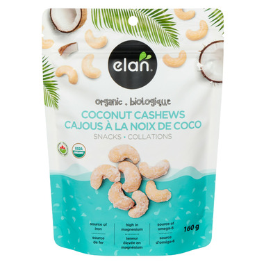 Deliciously good for you® Elan organic coconut cashews are roasted and coated in an addictive blend of organic coconut powder, Himalayan sea salt and cane syrup for a touch of sweetness. These delicious, crunchy cashews can add flavor to leafy green salads, muffins and healthy smoothies.