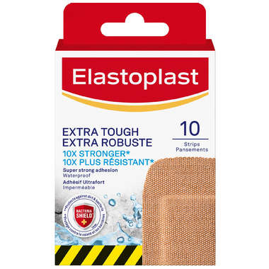 ELASTOPLAST Extra Tough XL Waterproof Plasters with Elastoplast Bacteria Shield* are extra flexible and breathable fabric strips. Made with innovative Hi-DRY TEX technology, this helps to create a durable protection in demanding situations such as outdoor activities, housework, gardening or DIY-projects. Elastoplast developed the three-layer technology for improved wound protection. Hi-DRY TEX technology makes the plaster waterproof, breathable and gives them strong adhesion without leaving residue. The flexible fabric ensures not only comfort for you, but also protection from moisture and water for your wound. The plasters are available as strips in different sizes which seal all around the wound, and as a dressing length which can be cut to the ideal size. Apply the plaster without stretching to achieve best results. The plaster also contains 0% latex. Always read the label and follow the directions for use. *Based on microbial testing. **Elastoplast Extra Tough bandages have 10 times stronger tensile strength than Elastoplast Plastic bandages. ***Compared to an untreated wound.