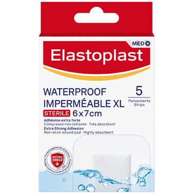 ELASTOPLAST Waterproof XL Dressings - Waterproof sterile dressings for post-operative and everyday large acute wounds. Elastoplast Waterproof XL Dressings are ideal for peace of mind when looking after post-operative and larger wounds. These XL dressings measure 6 x 7 cm to help seal the affected area against contamination from dirt or bacteria and feature a fully waterproof flexible film meaning they can stay on while showering, bathing or swimming. The non-stick, highly absorbent wound pad helps to protect and cushion the wound with a reliable 0% latex adhesion ensuring that the dressing stays in place during activity and in water.