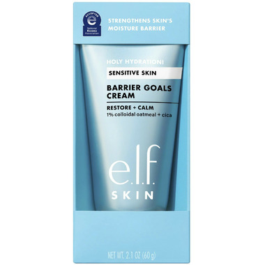 Meet your skins new barrier bestie. e.l.f. SKIN Holy Hydration! Barrier Goals Cream is a clinically proven face cream that works to replenish and strengthen skin's moisture barrier while delivering intense, fast-absorbing hydration. The rich and plush formula has a whipped, comfy texture and is formulated with 1% colloidal oatmeal to calm and nourish, Cica to visibly reduce redness, and hyaluronic acid to quench and leave skin plump and hydrated.