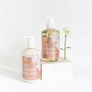 Rose & Vanilla Body Lotion: Aqua, Aloe Barbadensis (Aloe Vera) Leaf Juice, Persea Gratissima (Avocado) Oil, Glyceryl Stearate SE, Cocos Nucifera (Coconut) Oil, Butyrospermum Parkii (Shea) Butter, Glycerin, Helianthus Annuus (Sunflower) Seed Oil, Prunus Armeniaca (Apricot) Kernel Oil, Simmondsia Chinensis (Jojoba) Seed Oil, Hydrogenated Ethylhexyl Olivate, Argania Spinosa (Argan) Kernel Oil, Sodium Stearoyl Glutamate, Tocopherol (Vitamin E), Natural Fragrance*, Acer Rubrum (Red Maple) Extract, Xanthan Gum, Gluconolactone, Sodium Benzoate, Lactic Acid, *Proprietary blend of essential oils Rose & Vanilla Liquid Soap: Aqua (water/eau), Aloe Barbadensis (Aloe Vera) Leaf Juice, Sodium C14-16 alpha olefin sulfonate, Cocamidopropyl betaine, Glycerin, Coco glucoside, Sodium Lactate, Capryl/capryl glucoside, Sodium sunflowerseedate, Sodium Chloride/Maris Sal, Gluconolactone, Sodium citrate, Sodium benzoate, Natural Fragrance, Pelargonium roseum X asperum (rose geranium) essential oil, Vanilla Planifolia (vanilla) essential oil, Matricaria recutita (Chamomile) Flower Extract, Pogostemon Cablin (Patchouli) Essential Oil